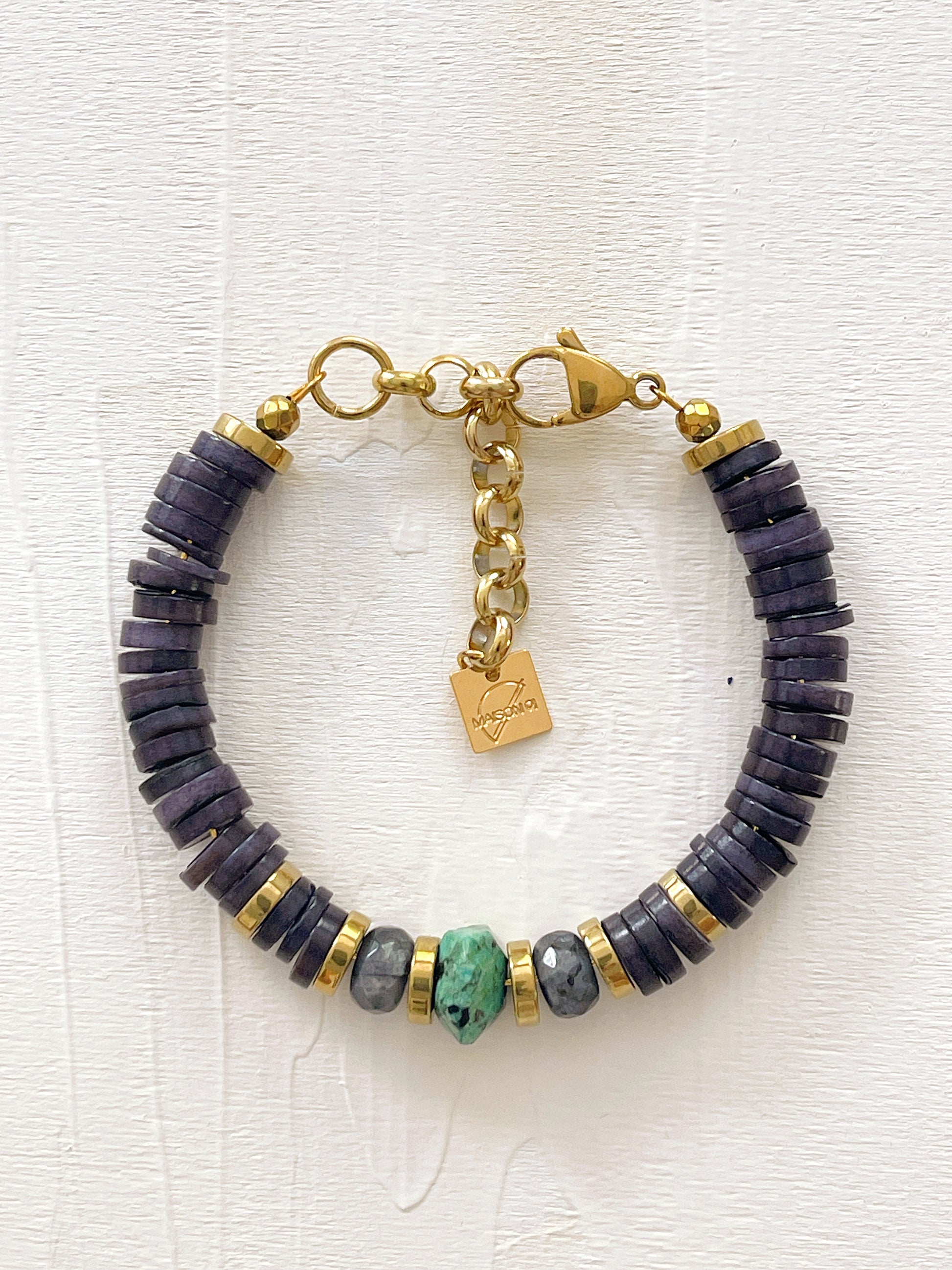 TOINON Brume, c’est la version minérale et brumeuse de l’iconique bracelet coquillage. Sa teinte grisée et givrée rappelle les matinées d’hiver un peu magiques, et sa Turquoise africaine t’aide à garder confiance et équilibre quand tout va trop vite. Avec l’Hématite dorée, on reste bien ancrée tout en douceur.