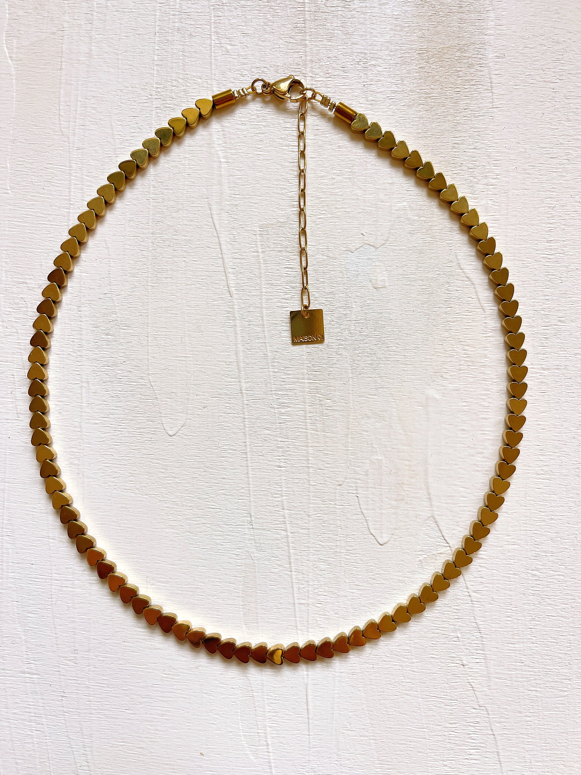 Le Cœur est là, l'attitude aussi. Oubliez la guimauve ! Ce collier prend le symbole classique du cœur et lui injecte une bonne dose de chic graphique. L'Hématite, puissante, apporte un contraste gold SO moderne. C'est l'équilibre parfait entre l'émotion et l'audace. Portez-le seul pour un look net ou empilez-le pour un effet "power stacking" sans effort. La pièce que vous nous avez demandée est enfin là!