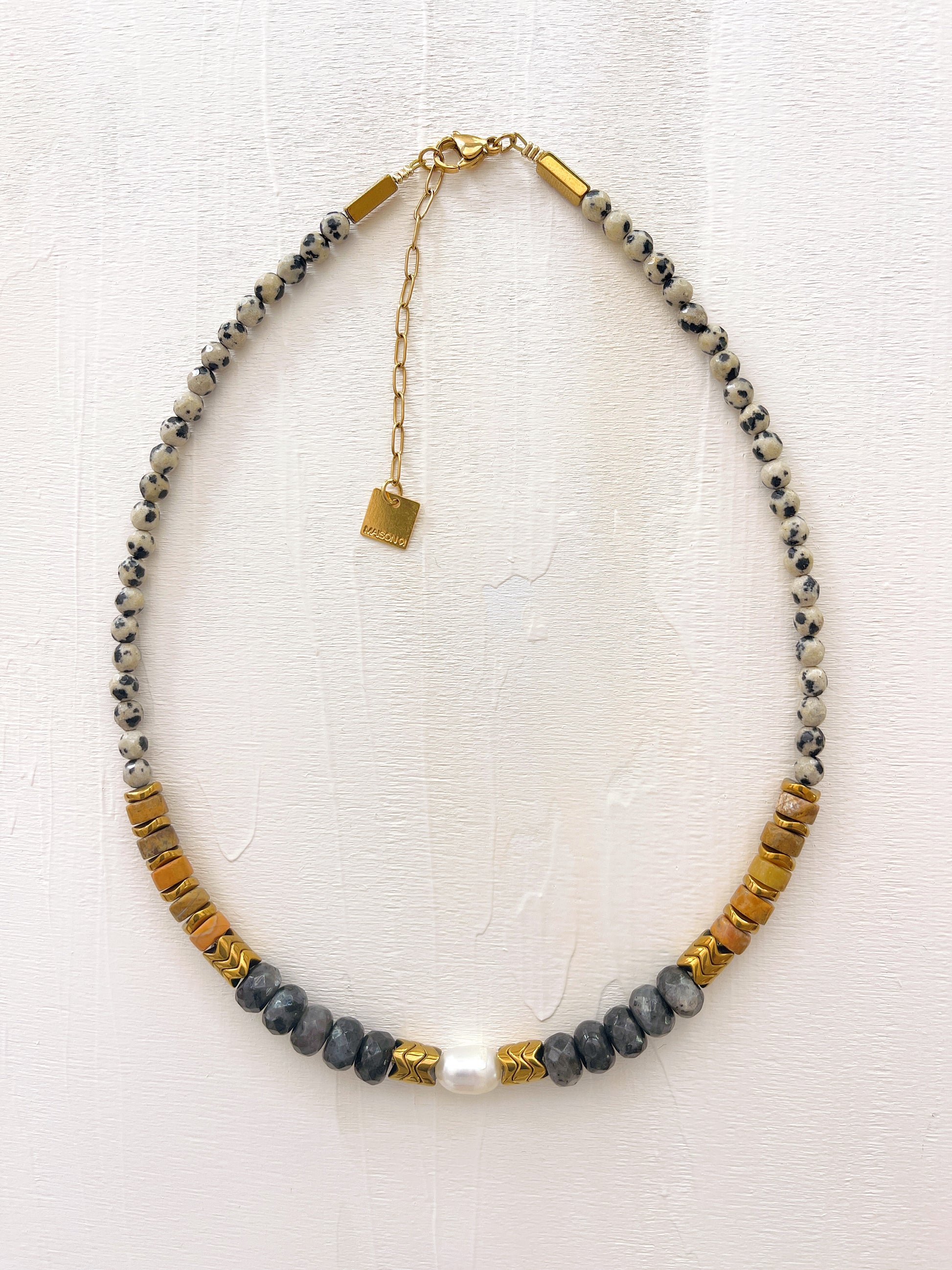 ° Jaspe dalmatien, Labradorite, Shoushan, Perle d'eau douce et Hématite doré