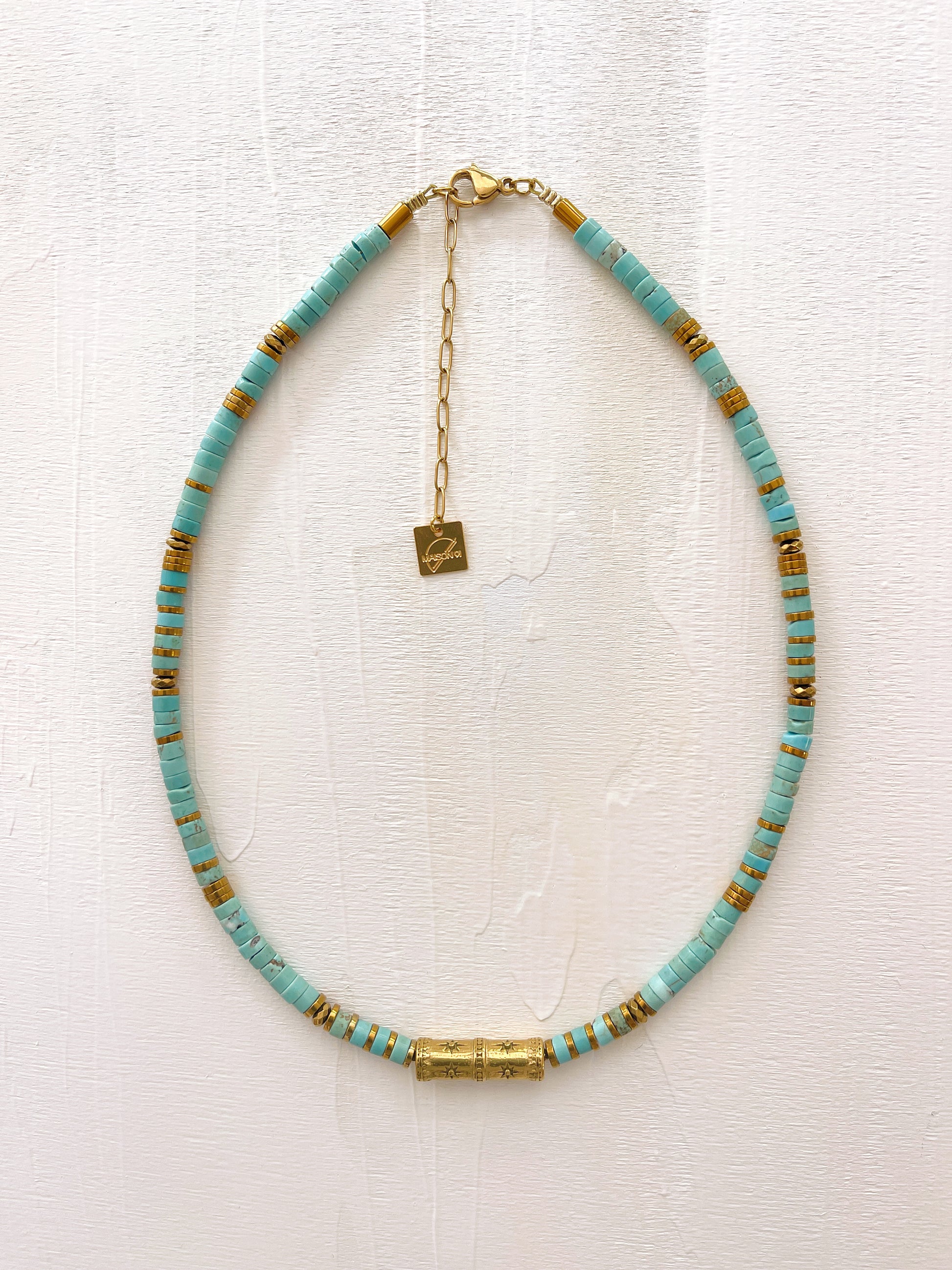 Un souffle d’évasion, même sous un ciel d’hiver. La Turquoise, lumineuse et vibrante, se mêle à l’éclat discret des perles d’Hématite dorée et à l’esprit cool des perles Heishi. La perle centrale dorée, qui tourne, ajoute ce petit twist original qu’on aime tant. Facile à porter seul ou en accumulation, ce modèle uni s’associe à merveille avec toutes tes pièces favorites. Pierre de protection et de communication, la turquoise est connue pour apporter confiance et ouverture aux autres.