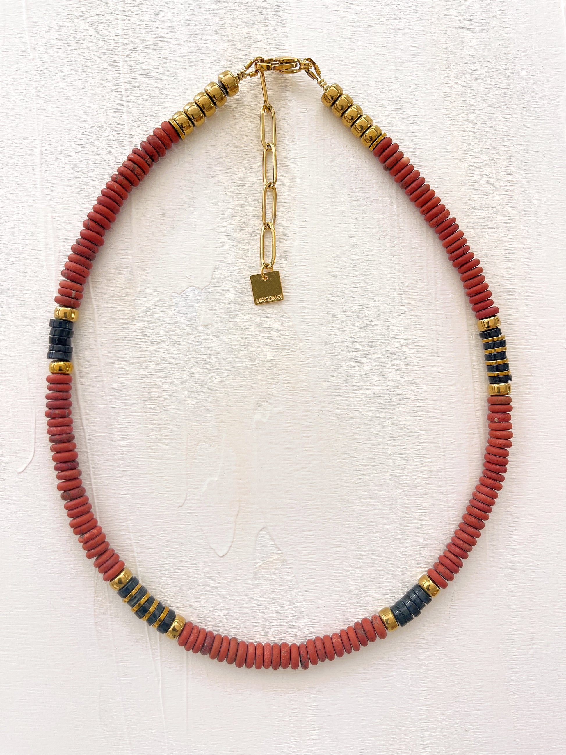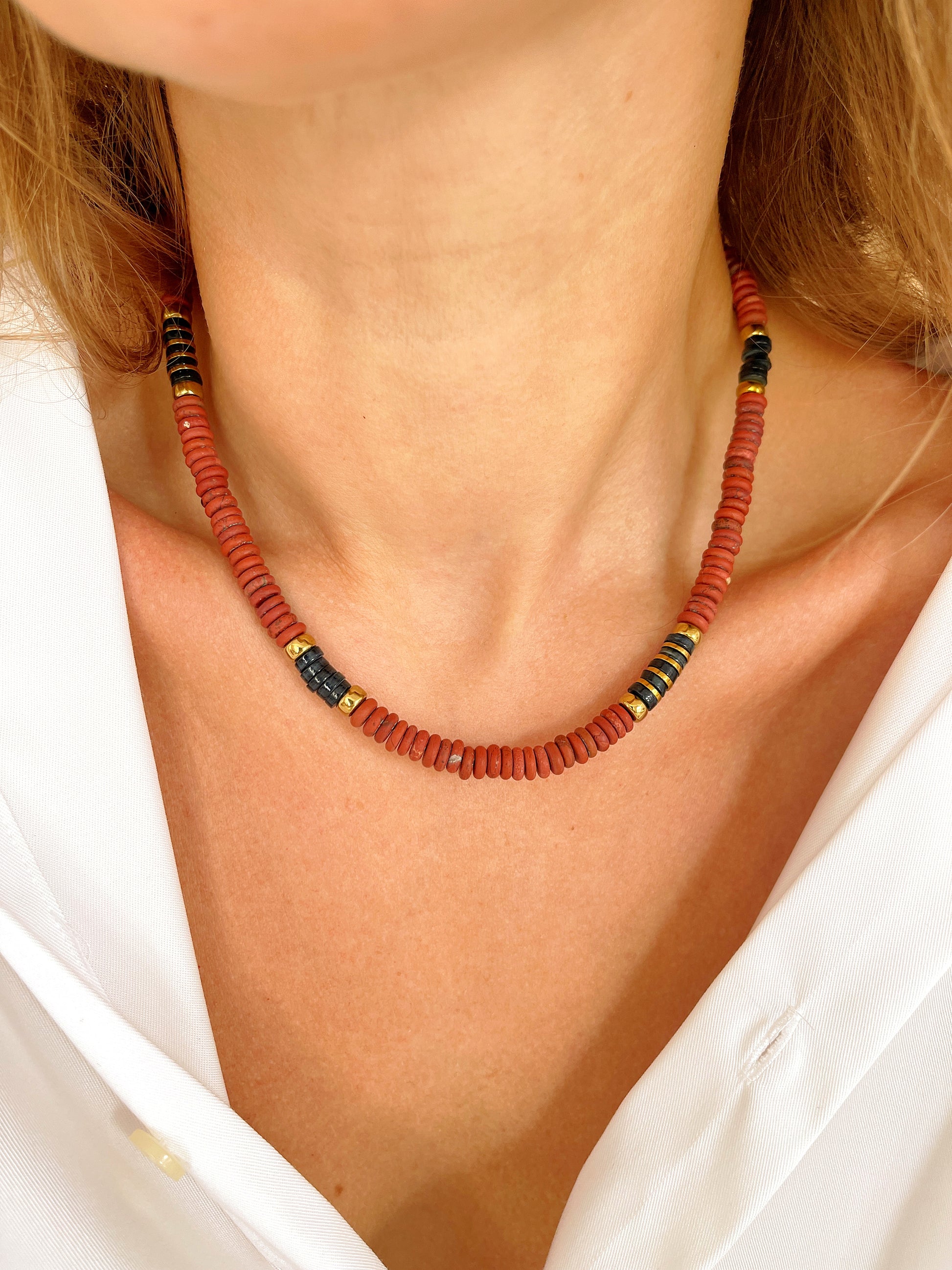 Ce collier surfeur mêle le caractère brut du Jaspe Rouge givré, à la texture unique, aux touches de coquillages teints et à l’éclat doré de l’Hématite. Un mix subtil entre esprit plage et énergie urbaine, pour un look à la fois décontracté et affirmé.