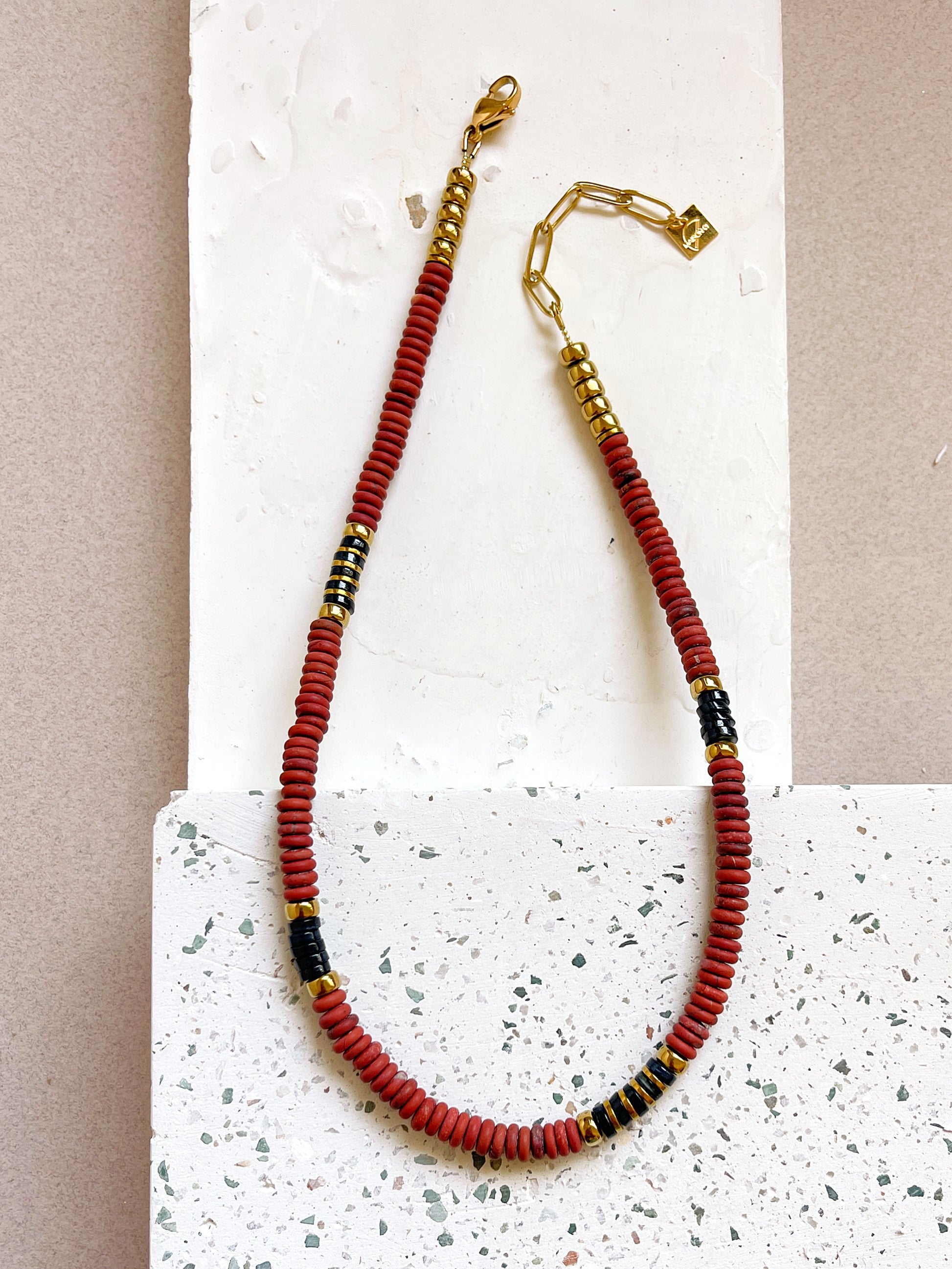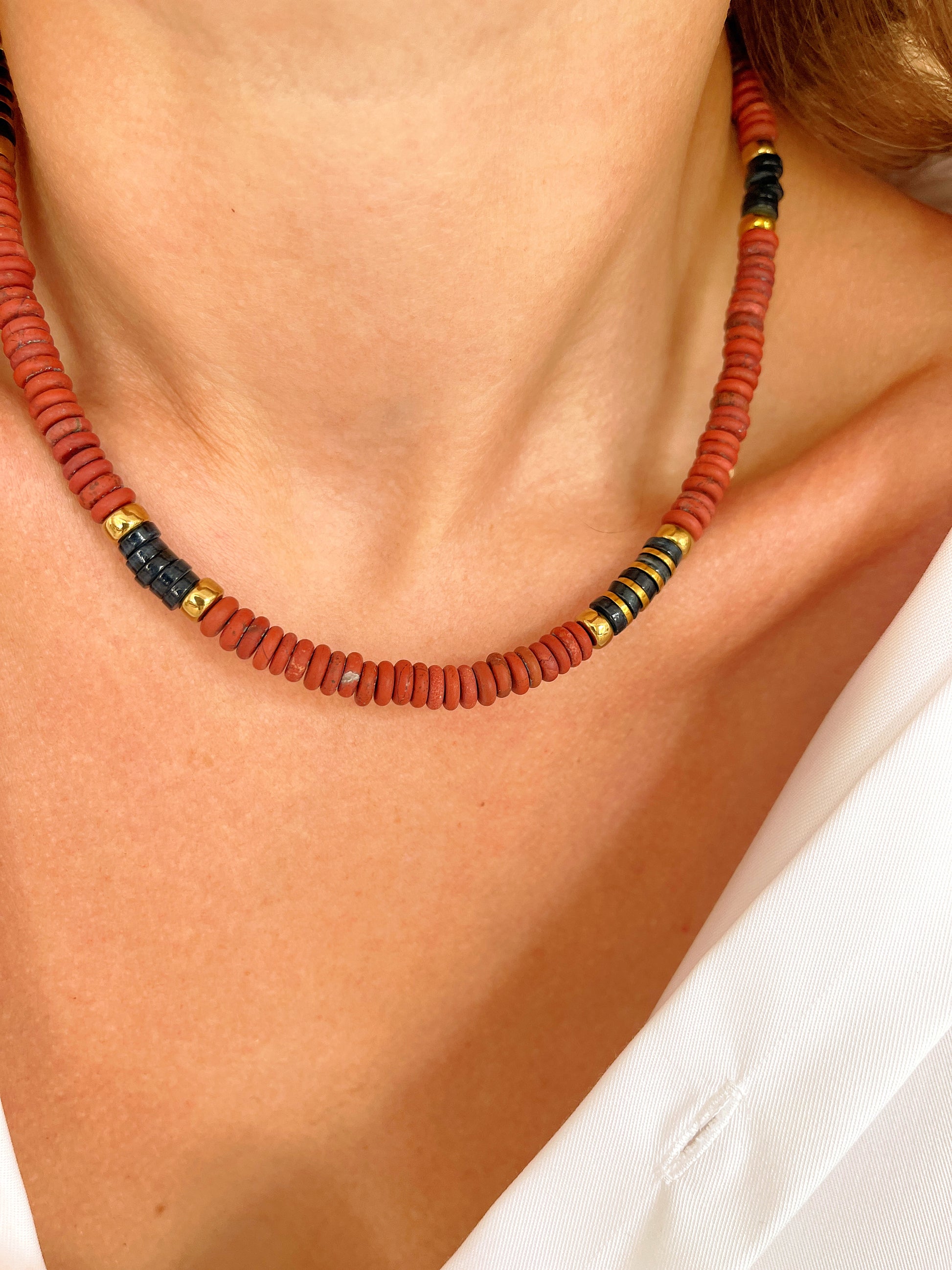 ° Jaspe rouge, Coquillage teint et Hématite doré