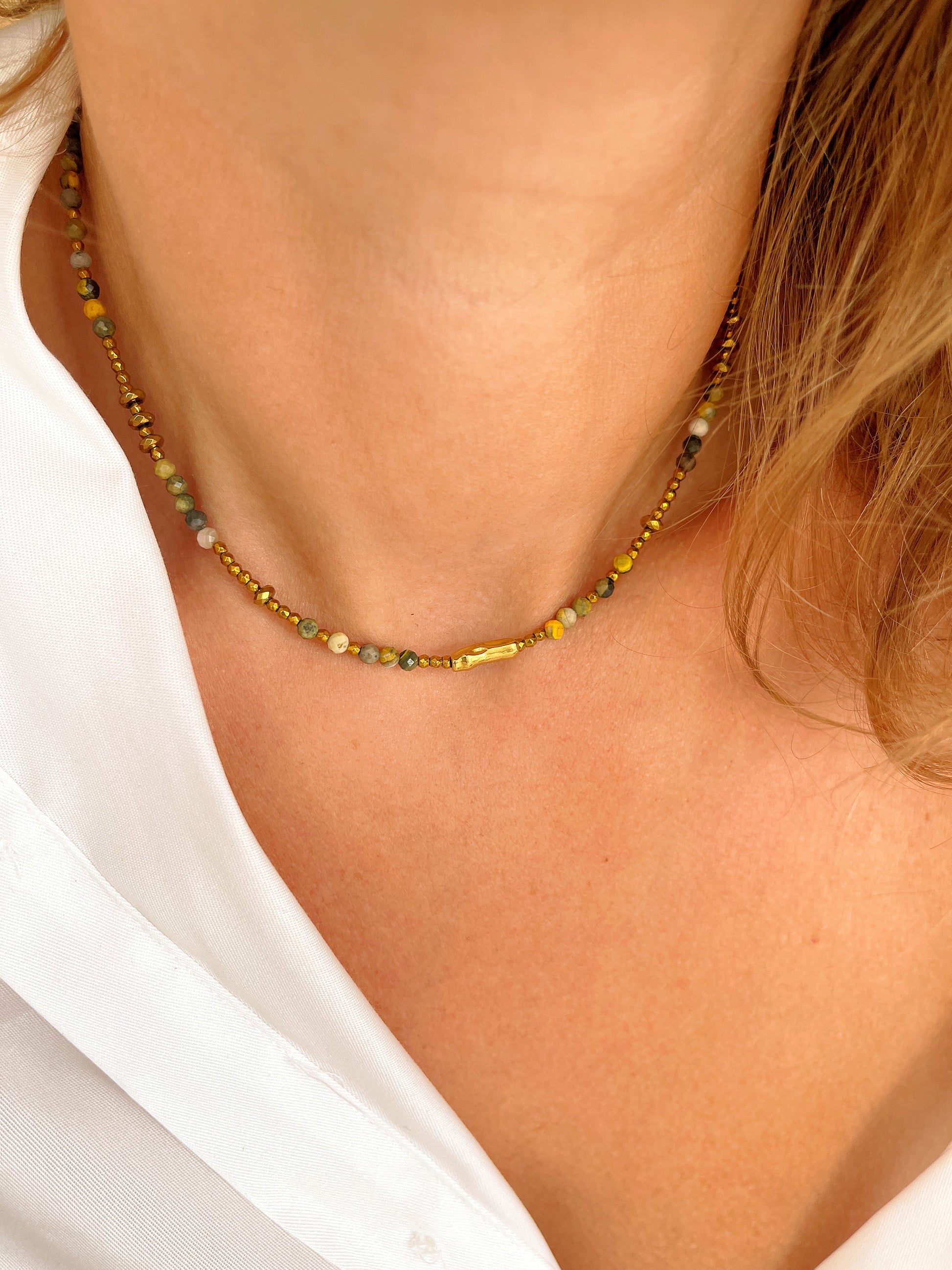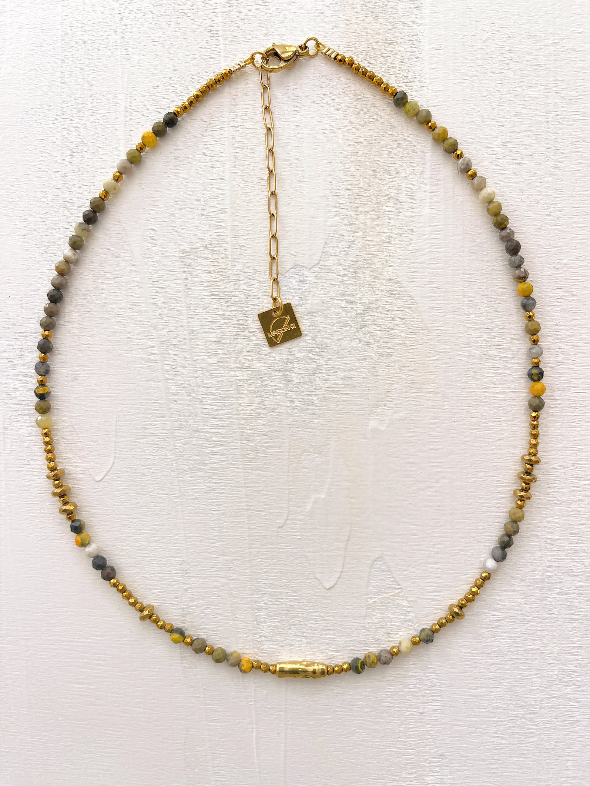 THAIS, c’est le ras-de-cou fin et délicat qu’on ne quitte plus. Sa perle dorée graphique au centre lui donne juste ce qu’il faut d’audace pour twister tes associations de colliers. Discret mais ultra-chic, il apporte une touche élégante et moderne à toutes tes tenues. En lithothérapie, le Jaspe Bourdon est reconnu pour sa vibration solaire et positive, symbole d’énergie vitale et d’affirmation de soi. Il aide à raviver la motivation, à cultiver la joie et à rester ancré même dans les périodes de changement, un vrai boost de bonne humeur au quotidien.